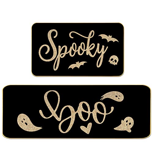 Spooky Bat Ghost Boo Black Kitchen Mats Set of 2, Fall Kitchen Decor Halloween Kitchen Rugs Set Seasonal Holiday Party Vintage Low-Profile Kitchen Runner Floor Carpet – 17×29 and 17×47 Inch