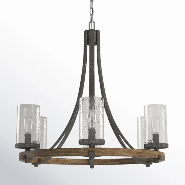 Add rustic elegance and inviting ambiance to your home with this wagon wheel chandelier. Featuring six lights, this statement fixture casts a warm, even glow over dining rooms, living areas, or open spaces. A water glass shade introduces subtle texture and sophistication, while the combination of metal and wood creates a balanced, timeless look that complements a wide range of décor styles. The adjustable chain allows you to customize the hanging height for the perfect fit, making this chandelier as practical as it is visually striking.