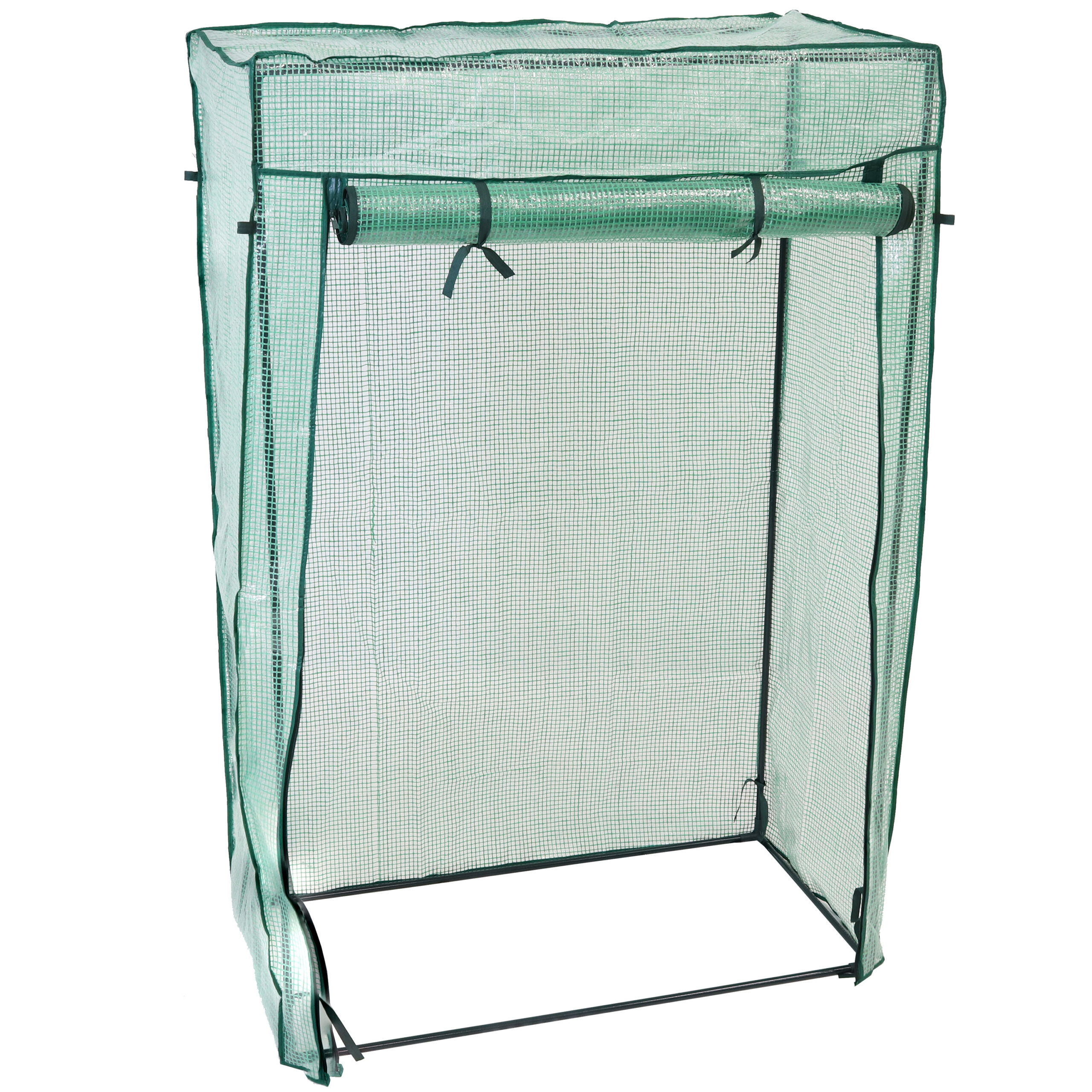Grow beautiful vegetables, fruits, and flowers easily with this portable tomato starter greenhouse. Place potted plants on the ground in the greenhouse or build the greenhouse over a garden to protect and promote growth for your tomatoes, peppers, beans, and other plants. Durably constructed from an iron tube frame with a polyethylene covering coated with a UV ray protective finish, this tomato house is sure to keep your plants safe during inclement weather. The cover is transparent to allow plenty of sunlight to shine through. A roll-up door with side zippers keeps your plants contained and allows you to control airflow in and out of the greenhouse.
