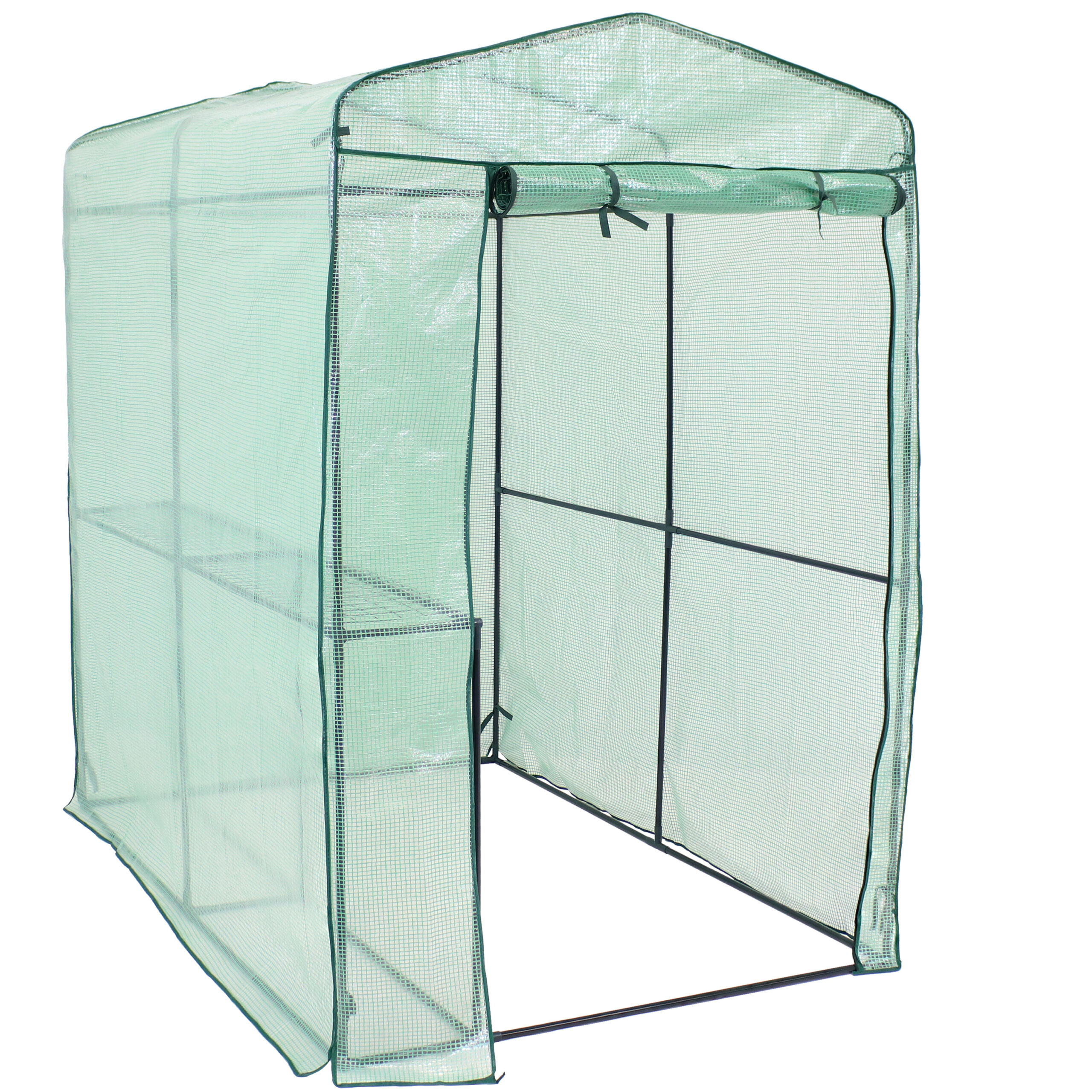 Extend your growing season with this walk-in greenhouse! With one shelf for storing plants and supplies, this outdoor greenhouse is perfect for creating the ideal growing climate for all your favorite vegetables, fruits, and flowers. Durably constructed from an iron tube frame with a steel wire shelf and a UV-protected polyethylene covering, this greenhouse is sure to last through several growing seasons. The cover protects plants from UV rays and inclement weather, like frost, excessive heat, and moisture. A roll-up door makes entering and exiting the mini walk-in greenhouse easy and allows you to control air flow in and out of the greenhouse.