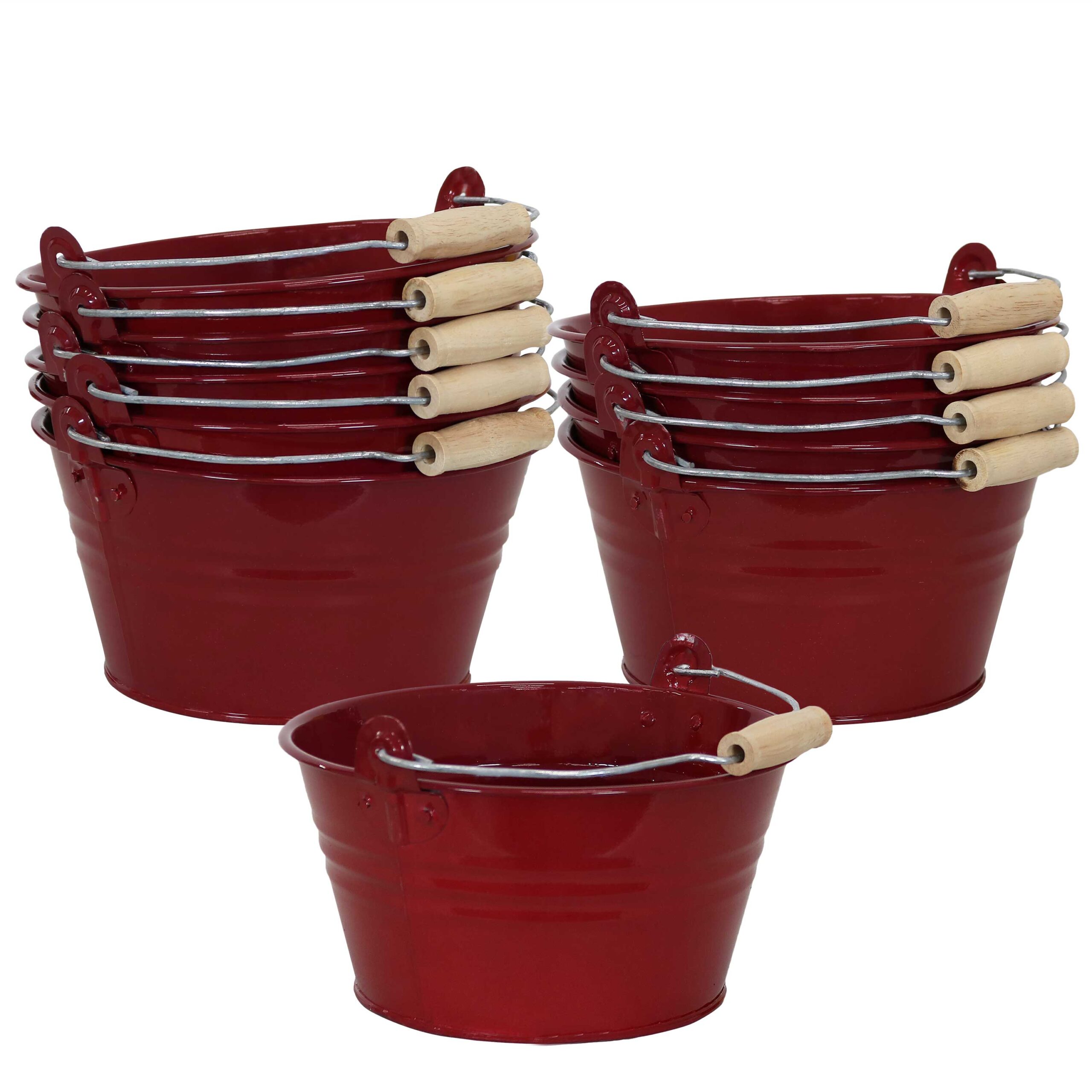 Whether you’re looking for colorful storage containers, indoor planters to hold your flowers, or ice buckets, these galvanized steel buckets with handles will satisfy your needs. Each set includes 10 small steel buckets and are offered in a variety of attractive colors to best fit your decor style. These steel buckets can also be used as a trash can, wedding or party centerpiece, or storing a variety of items.