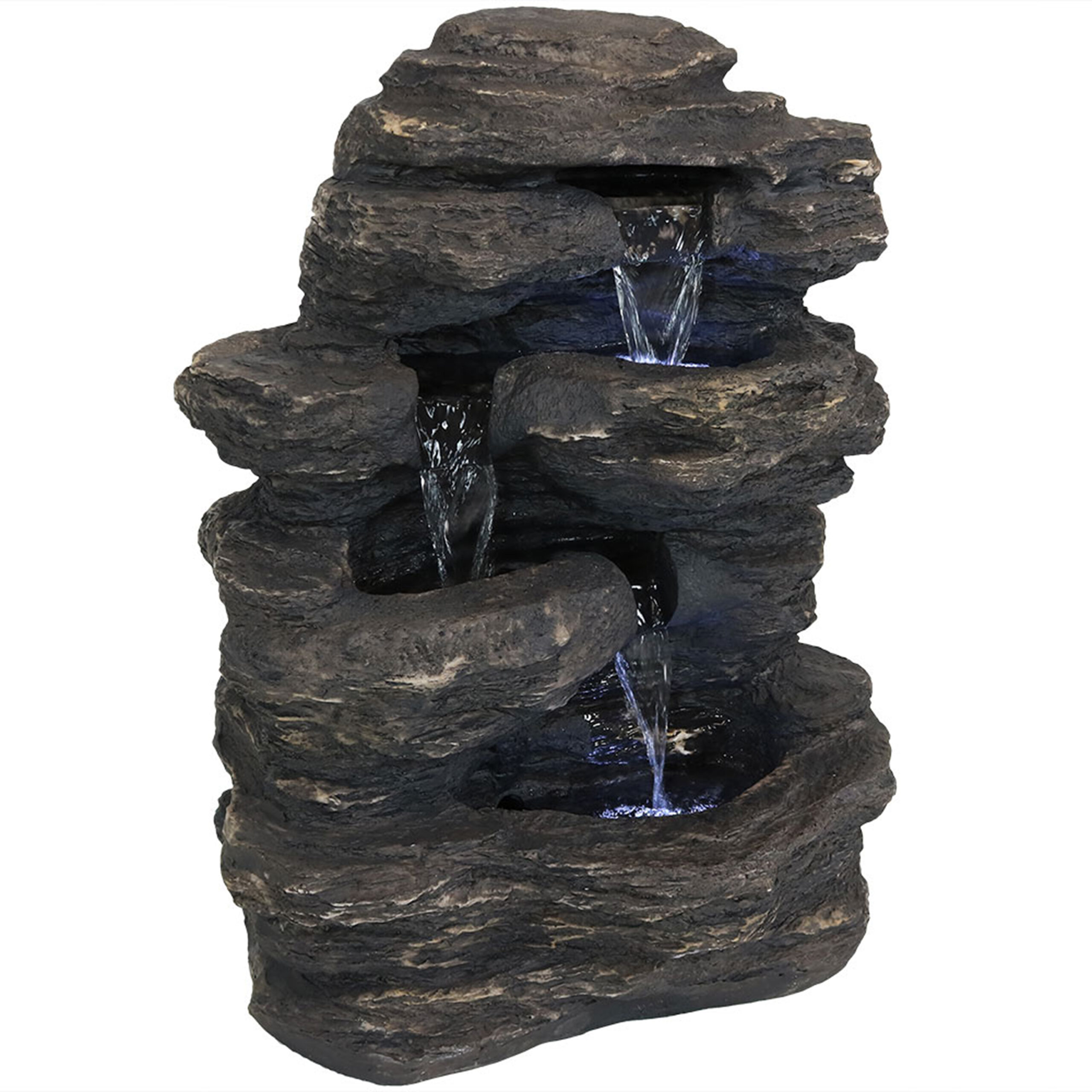 Make a nature-inspired statement to your garden with this stunning outdoor rock waterfall fountain. Unwind to soothing sounds as water gracefully flows from the top level all the way down to the bottom basin, where it recirculates back up through the electric pump. Made of dependable polystone material, this outdoor rock water fountain replicates real stone with added durability and longevity. Plus, no complicated plumbing is required, Simply fill with water, plug in, and enjoy.