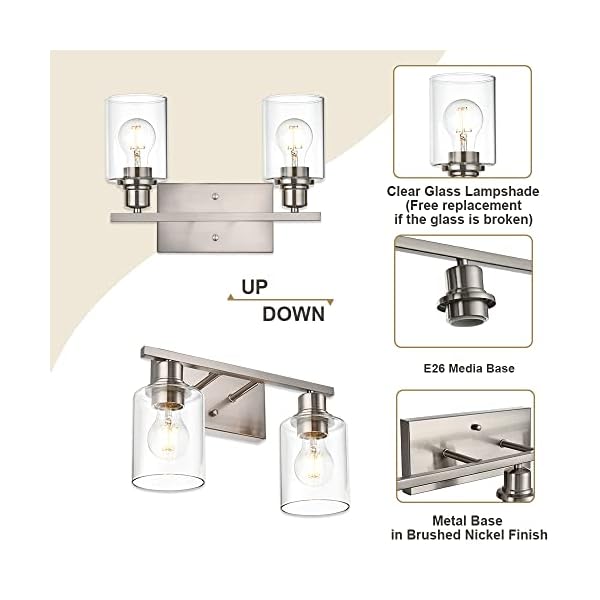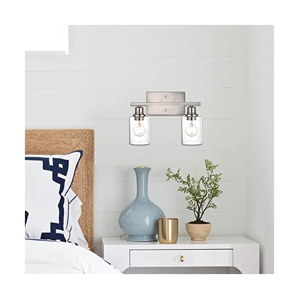 VINLUZ Modern Bathroom Vanity Light,2 Light Industrial Wall Sconces in Brushed Nickel Finish Indoor Metal Base Wall Mounted Fixture with Clear Glass Shade