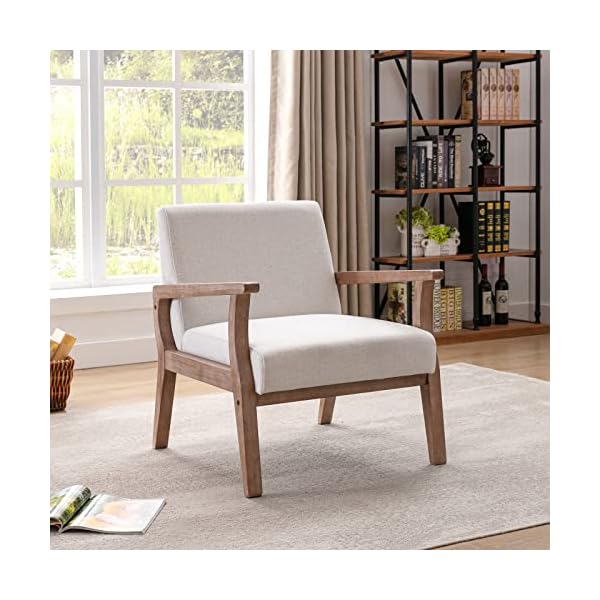 Wahson Mid Century Armchair with Wood Frames, White Linen Upholstered Farmhouse Living Room Chair, for Living Room Bedroom, Ivory