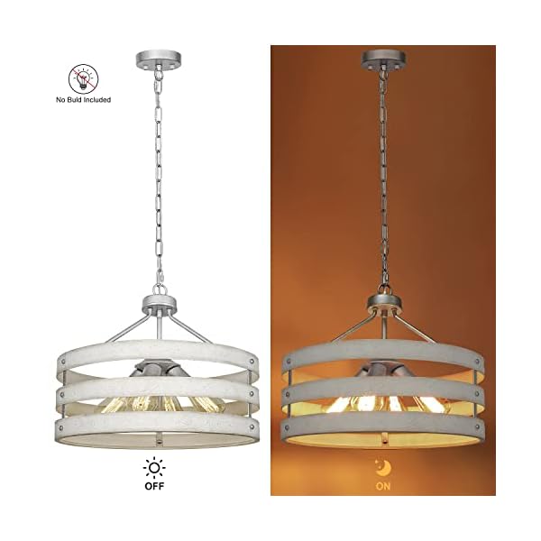 ????【Farmhouse-inspired design 】This coastal rustic chandelier is inspired by brand new farmhouse style and barn design. The appearance of whitewashed faux wood finish and galvanized metal makes farmhouse dining room light not only lighting, but also a work of art in your house, will add a rustic aesthetic ambiance to your space.