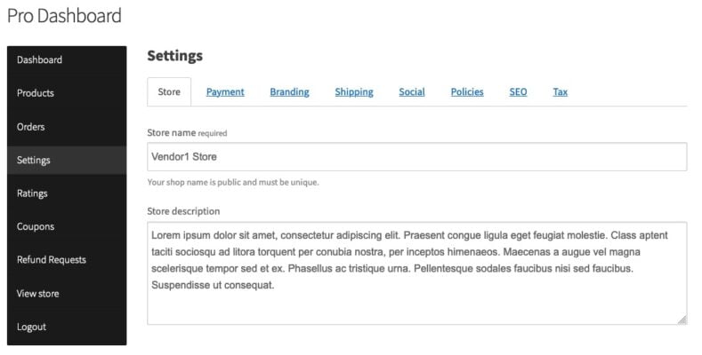 The vendor dashboard is the control center to manage your store. This is where you can get an up-to-date view of everything that is happening in your store. You can see your order totals, commissions due and paid, product, order management. You can update your settings, view ratings, create coupons and more.